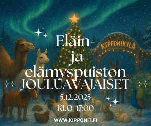 KIPPONIT KYLÄ AVAUTUU 5.12.2025 UUDISTETTUNA JA TÄYNNÄ UUSIA JÄNNITTÄVIÄ ELÄIMIÄ! TULE NÄKEMÄÄN TAIANOMAINEN JOULUELÄMYSPUISTO!Kipponit Kylässä voi tutustua erilaisiin ja eksoottisiinkin eläimiin, osallistua kylän aktiviteetteihin, kuten poniratsastukseen, kärryajoon, leikkiä ja ratkoa eri-ikäisille suunnattuja Kipponit mökkeihin liittyviä tehtäviä ja paljon muuta!